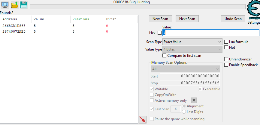 Options 1 and 3 are probably the easiest, and are the ones I show in the walkthrough video. Let's go with cheat engine this time! We can attach it to the game process and search for the value 0 in memory (our initial score).